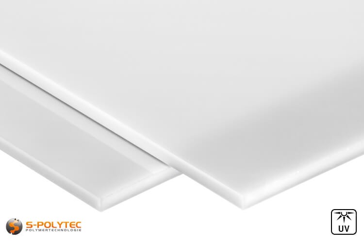 Acrylglasplatten in opaler Ausführung, sind bei uns in einer Stärke von 5mm im Standardlieferprogramm. Bei unseren opalen Acrylglas Platten handelt es sich um massive Plattenwaren und nicht um Hohlkammer- oder Doppelstegplatten. Des Weiteren sind unsere Platten vollständig in weiß durchgefärbt, so dass Oberflächen und Schnittkanten die gleiche weiß Farbe aufweisen. Die glänzenden Oberflächen der opalen Platten sind beidseitig mit einer Schutzfolie versehen, um Beschädigungen vor und während der Verarbeitung zu verhindern.